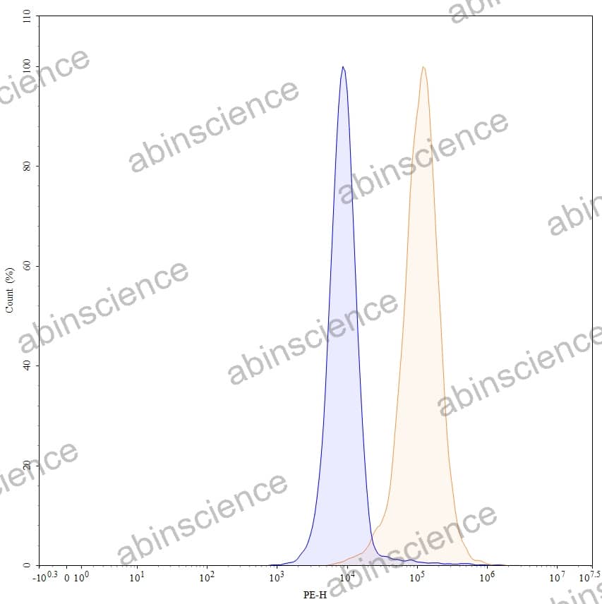 Flow-cytometry using PE anti-human CD49a antibody. Hela cells were stained with an irrelevant antibody (Blue Histogram) or an PE anti-human CD49a monoclonal antibody (Catalog: HX227127, Yellow Histogram) at a concentration of 5 µg/ml for 30 mins at RT. After washing, and cells analysed on a NovoCyte Flow Cytometer. |