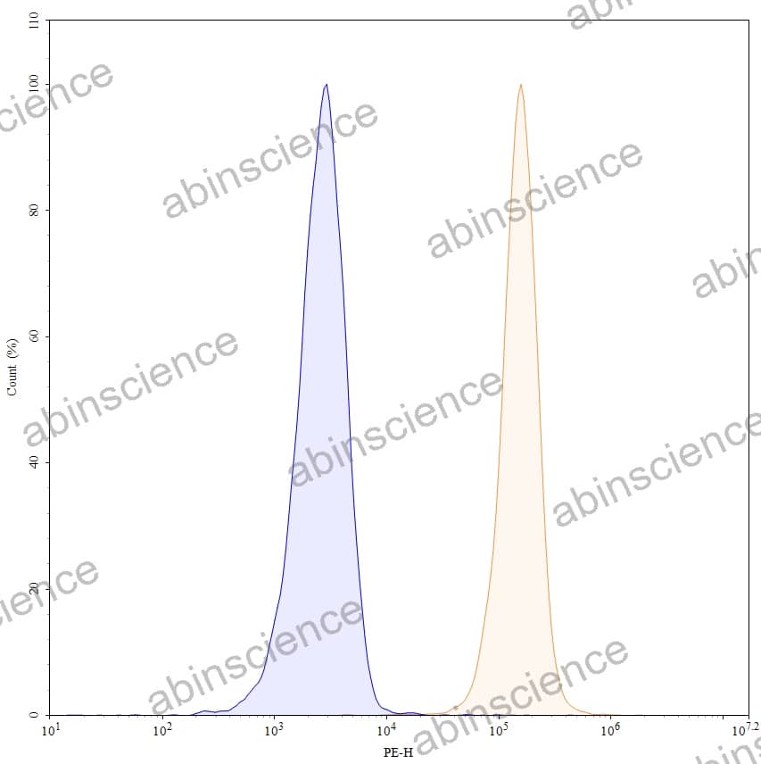 Flow-cytometry using PE anti-human CD172a antibody. U937 cells were stained with an irrelevant antibody (Blue Histogram) or an PE anti-human CD172a monoclonal antibody (Catalog: HX892127, Yellow Histogram) at a concentration of 5 µg/ml for 30 mins at RT. After washing, and cells analysed on a NovoCyte Flow Cytometer.