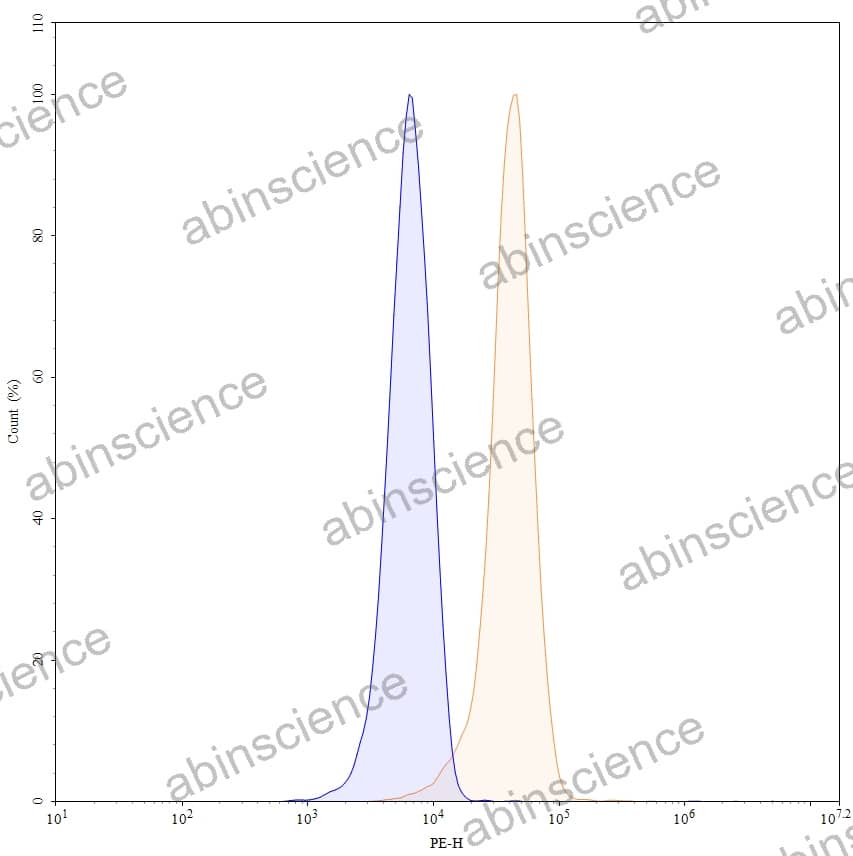 Flow-cytometry using PE anti-human ANGPT2 antibody. HUVEC cells were fixed and permeabilized, then stained with an irrelevant antibody (Blue Histogram) or an PE anti-human ANGPT2 monoclonal antibody (Catalog: HC281127, Yellow Histogram) at a concentration of 5 µg/ml for 30 mins at RT. After washing, cells analysed on a NovoCyte Flow Cytometer. |