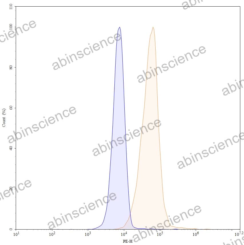 Flow-cytometry using PE anti-human CD276 antibody. PC-3 cells were stained with an irrelevant antibody (Blue Histogram) or an PE anti-human CD276 monoclonal antibody (Catalog: HV612227, Yellow Histogram) at a concentration of 5 µg/ml for 30 mins at RT. After washing, cells analysed on a NovoCyte Flow Cytometer. |