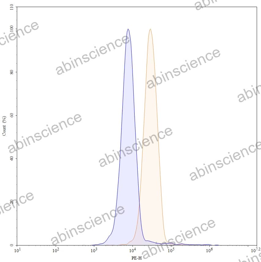 Flow-cytometry using PE anti-human SIGLEC15 antibody. U87 cells were stained with an irrelevant antibody (Blue Histogram) or an PE anti-human SIGLEC15 monoclonal antibody (Catalog: HP516127, Yellow Histogram) at a concentration of 5 µg/ml for 30 mins at RT. After washing, cells analysed on a NovoCyte Flow Cytometer.