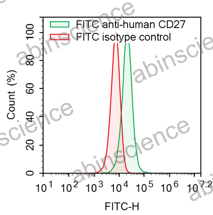 Flow-cytometry using FITC anti-Human CD27 antibody. Raji cells were stained with an irrelevant antibody (Red Histogram) or a FITC anti-Human CD27 antibody monoclonal antibody (Catalog # HB796317 , Green Histogram) at a concentration of 5 µg/ml for 30 mins at RT. After washing, cells analysed on a NovoCyte Flow Cytometer. |