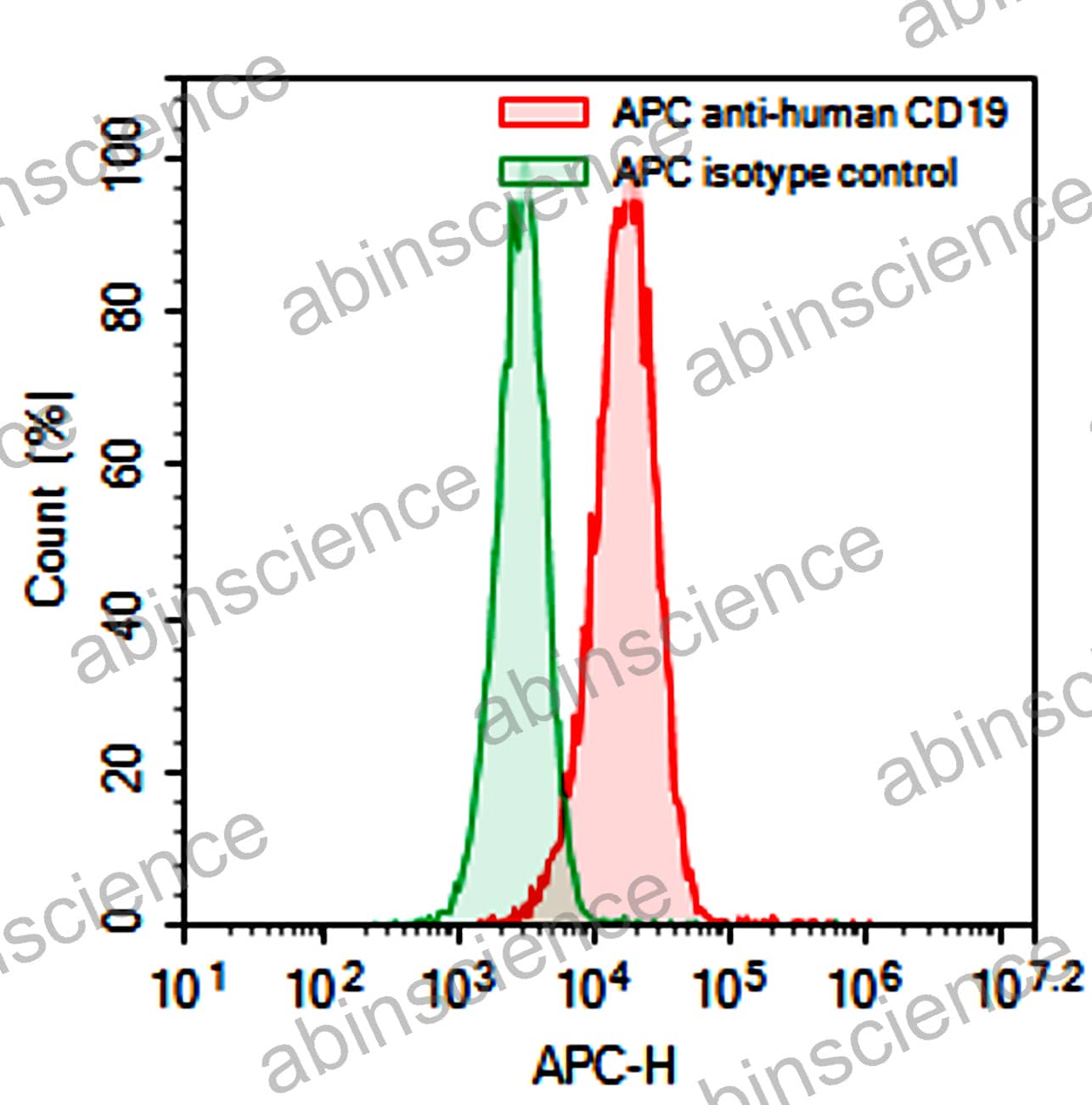 Flow-cytometry using APC anti-Human CD19 antibody. Raji cells were stained with an irrelevant antibody (Green Histogram) or an APC anti-Human CD19 antibody monoclonal antibody (Catalog # HV426137 , Red Histogram) at a concentration of 5 µg/ml for 30 mins at RT. After washing, cells analysed on a NovoCyte Flow Cytometer.