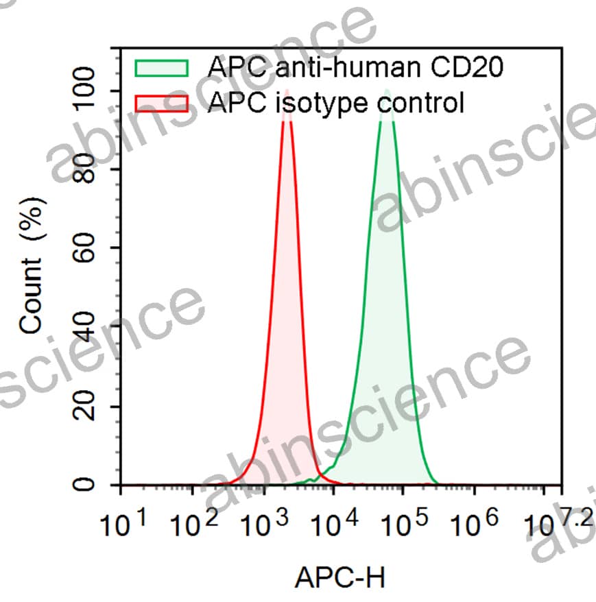 Flow-cytometry using APC anti-Human CD20 antibody. Daudi cells were stained with an irrelevant antibody (Red Histogram) or an APC anti-Human CD20 antibody monoclonal antibody (Catalog # HY257537 , Green Histogram) at a concentration of 5 µg/ml for 30 mins at RT. After washing, cells analysed on a NovoCyte Flow Cytometer. |