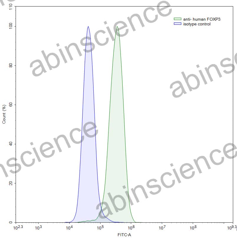Flow-cytometry using anti-human FOXP3 antibody. Hela cells were stained with an irrelevant antibody (Blue Histogram) or an anti-human FOXP3 antibody monoclonal antibody (Catalog # HV388045, Green Histogram) at a concentration of 5 µg/ml for 30 mins at RT. After washing, bound antibody was detected using a FITC conjugated goat anti-mouse antibody (MF690414) and cells analysed on a NovoCyte Flow Cytometer.