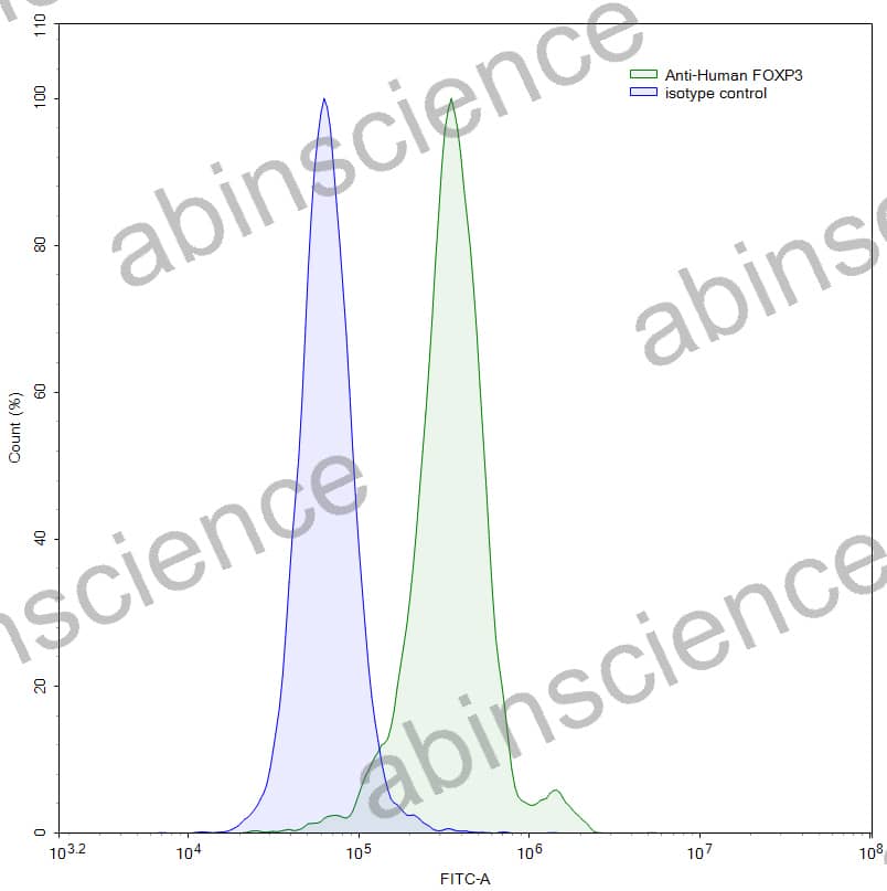 Flow-cytometry using anti-human FOXP3 antibody. Jurkat cells were stained with an irrelevant antibody (Blue Histogram) or an anti-human FOXP3 antibody monoclonal antibody (Catalog # HV388045, Green Histogram) at a concentration of 5 µg/ml for 30 mins at RT. After washing, bound antibody was detected using a FITC conjugated goat anti-mouse antibody (MF690414) and cells analysed on a NovoCyte Flow Cytometer.