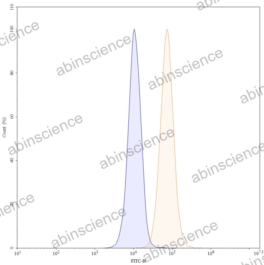 Flow-cytometry using FITC anti-human CD40 antibody. U2OS cells were stained with an irrelevant antibody (Blue Histogram) or an FITC anti-human CD40 monoclonal antibody (Catalog: HB782096, Yellow Histogram) at a concentration of 5 µg/ml for 30 mins at RT. After washing, and cells analysed on a NovoCyte Flow Cytometer.