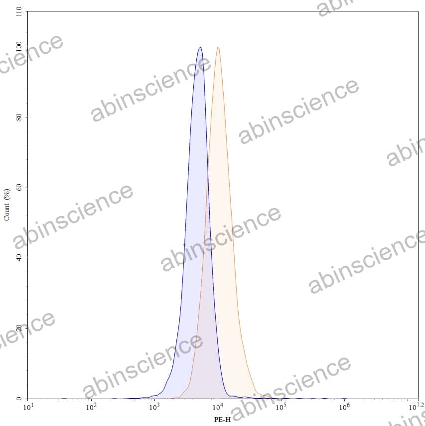 Flow-cytometry using PE anti-human CD40 antibody. U2OS cells were stained with an irrelevant antibody (Blue Histogram) or an PE anti-human CD40 monoclonal antibody (Catalog: HB782096, Yellow Histogram) at a concentration of 5 µg/ml for 30 mins at RT. After washing, and cells analysed on a NovoCyte Flow Cytometer.
