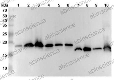 Western blot analysis was performed using anti-SOD1 polyclonal antibody at 1ug/mL on various samples. Lane 1: Hela cell lysate Lane 2: 293T cell lysate Lane 3: Jurkat cell lysate Lane 4: K562 cell lysate Lane 5: HepG2 cell lysate Lane 6: MCF-7 cell lysate Lane 7: Mouse brain lysate Lane 8: Mouse liver lysate Lane 9: Rat brain lysate Lane 10: Rat liver lysate