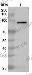 Western blot analysis was performed using anti-MPO  polyclonal antibody at 1ug/mL  on various samples. Lane 1: HL-60 cell lysate