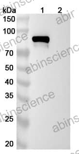Western blot analysis was performed using anti-CD71/TFRC monoclonal antibody at 1ug/mL on various samples. Lane 1: recombinant human CD71/TFRC (Catalog No: HY036011) Lane 2: negative control