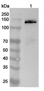 Western blot analysis was performed using anti-IVL polyclonal antibody at 1ug/mL on various samples. Lane 1: Hacat cell lysate