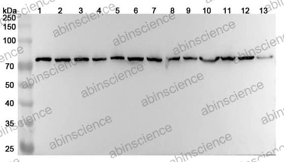 Western blot analysis was performed using anti-HSPA8 polyclonal antibody at 1ug/mL on various samples. Lane 1: 4T1 cell lysate Lane 2: MCF-7 cell lysate Lane 3: PC-12 cell lysate Lane 4: NIH3T3 cell lysate Lane 5: Hela cell lysate Lane 6: U87 cell lysate Lane 7: Jurkat cell lysate Lane 8: HepG2 cell lysate Lane 9: A549 cell lysate Lane 10: Mouse brain lysate Lane11: Mouse heart lysate Lane12: Rat brain lysate Lane13: Rat heart lysate