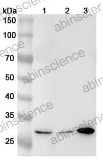 Western blot analysis was performed using anti-NQO1 polyclonal antibody at 1ug/mL on various samples. Lane 1: Lncap cell lystae Lane 2: LO2 cell lysate Lane 3: A549 cell lysate