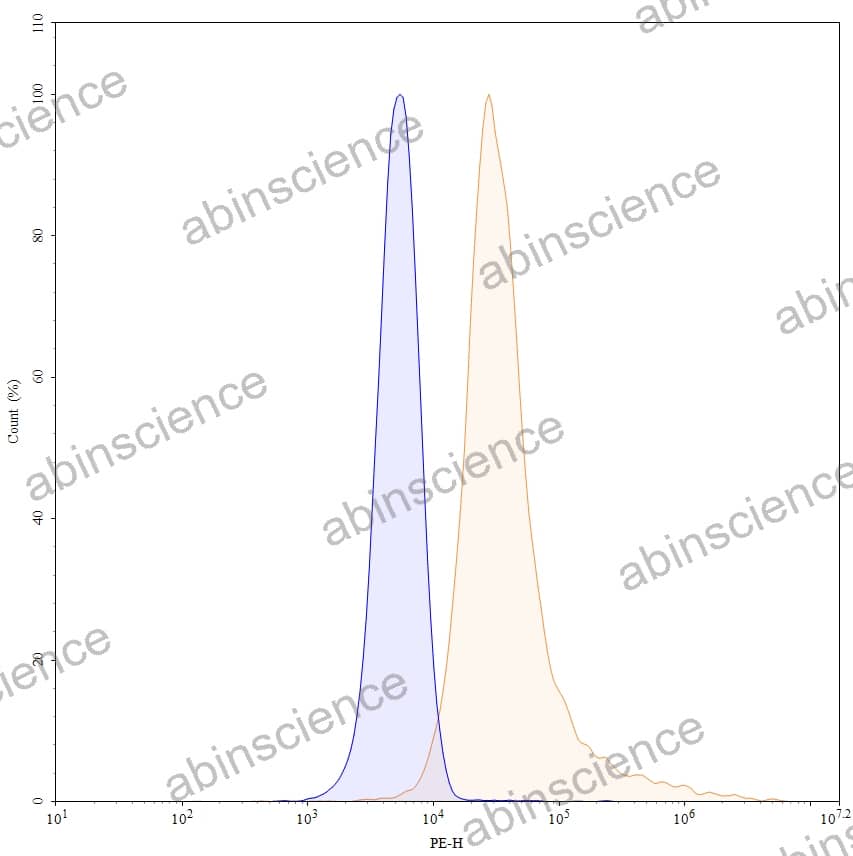 Flow-cytometry using PE anti-human CD136 antibody. SW480 cells were stained with an irrelevant antibody (Blue Histogram) or an PE anti-human CD136 monoclonal antibody (Catalog: HC609016, Yellow Histogram) at a concentration of 5 µg/ml for 30 mins at RT. After washing, and cells analysed on a NovoCyte Flow Cytometer. |