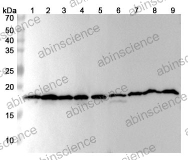 Western blot analysis was performed using anti-CFL1 polyclonal antibody at 1ug/mL on various samples. Lane 1: NIH3T3 cell lysate Lane 2: MCF-7 cell lysate Lane 3: H1299 cell lysate Lane 4: Hela cell lysate Lane 5: Jurkat cell lysate Lane 6: SH-SY5Y cell lysate Lane 7: PC-12 cell lysate Lane 8: Mouse brain lysate Lane 9: Rat brain lysate