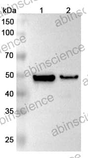 Western blot analysis was performed using anti-MAT2A polyclonal antibody at 1μg/ml on various samples. Lane 1: Mouse liver lysate Lane 2: Rat liver lysate
