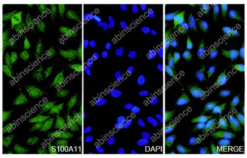Hela cells were fixed with 4% paraformaldehyde for 20 minutes, followed by blocking with 5% goat serum for 1 hour. The cells were then incubated with a primary antibody targeting S100A11 (HB147014) at a concentration of 27 ug/ml overnight at 4°C. Afterward, the cells were incubated with a secondary antibody, Goat Anti-Rabbit IgG (Alexa Fluor-488) for 50 minutes at room temperature. The localization of S100A11 was visualized (shown in green), and nuclear DNA was stained with DAPI (shown in blue). |