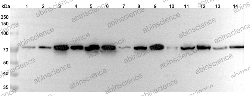 Western blot analysis was performed using anti-HSPA1L polyclonal antibody at 1μg/ml on various samples.