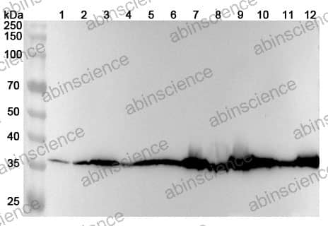Western blot analysis was performed using anti-MDH1 polyclonal antibody at 1ug/mL on various samples. Lane 1: Hela cell lysate Lane 2: HepG2 cell lysate Lane 3: HL-60 cell lysate Lane 4: Jurkat cell lysate Lane 5: NIH3T3 cell lysate Lane 6: THP-1 cell lysate Lane 7: Mouse brain lysate Lane 8: Mouse liver lysate Lane 9: Mouse kidney lysate Lane 10: Rat brain lysate Lane11: Rat liver lysate Lane12: Rat kidney lysate