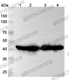 Western blot analysis was performed using anti-ACAA2 polyclonal antibody at 1μg/ml on various samples.