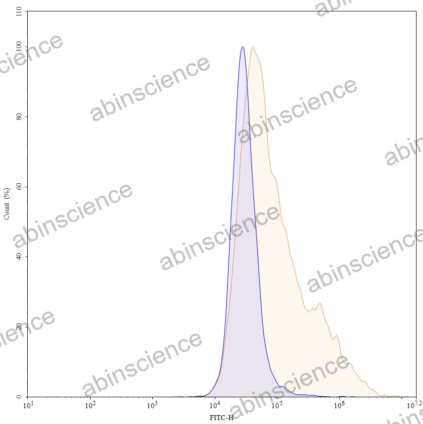 Flow-cytometry using anti-human ERBB3 antibody. Untransfected cells (blue Histogram) and Transfected cells (Yellow Histogram) were stained with an anti-human ERBB3 monoclonal antibody (Catalog: HY353076) at a concentration of 5 µg/ml for 30 mins at RT. After washing, bound antibody was detected using a Goat Anti-Human IgG H&L Polyclonal Antibody, FITC (abinScience: HF690414) and cells analysed on a NovoCyte Flow Cytometer. |