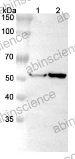 Western blot analysis was performed using anti-ABAT polyclonal antibody at 1μg/ml on various samples. Lane 1: Rat liver lysate Lane 2: Rat kindney lysate