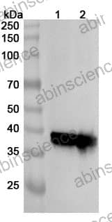 Western blot analysis was performed using anti-ARG1/Arginase-1 polyclonal antibody at 1ug/mL on recombinant ARG1/Arginase-1 (Catalog No. HY339022).