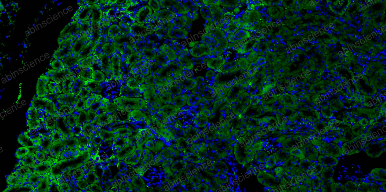 Mouse kidney tissue section stained by immunofluorescence showing PINK1 protein (green) mainly in renal tubules, with nuclei counterstained by DAPI (blue).