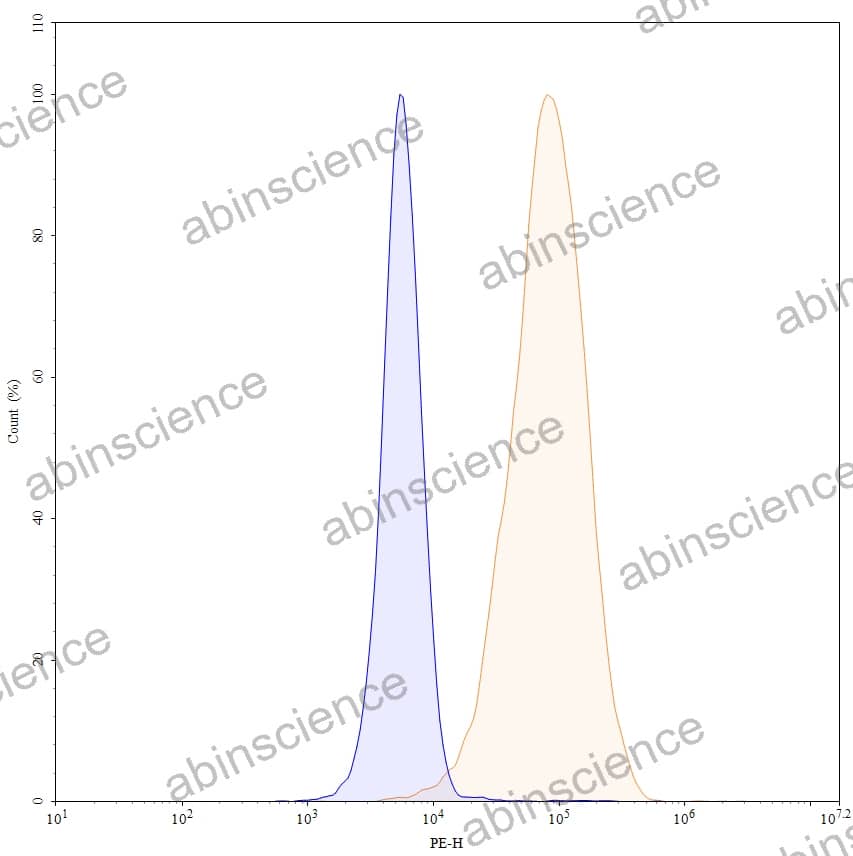 Flow-cytometry using PE anti-human CD140a antibody. MG-63 cells were stained with an irrelevant antibody (Blue Histogram) or an PE anti-human CD140a monoclonal antibody (Catalog: HB927127, Yellow Histogram) at a concentration of 5 µg/ml for 30 mins at RT. After washing, and cells analysed on a NovoCyte Flow Cytometer.
